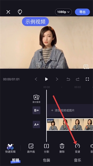 3、进入视频剪辑界面后,在底部的功能栏里找到“变速”选项并点击,就能对视频的播放速度进行调整了。