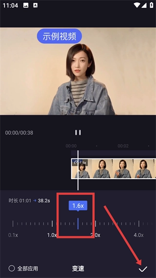 4、进入变速设置界面后,挑选想要的目标速度(例如1.6倍速),确认好速度数值后点击对应的确认按钮,这样就能完成视频播放速度的调整操作了。