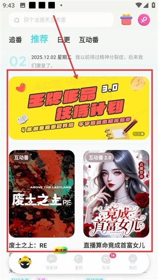 1、在推荐页面点击你感兴趣的作品封面,就能进入阅读界面,之后就可以体验这部互动番的剧情内容了。
