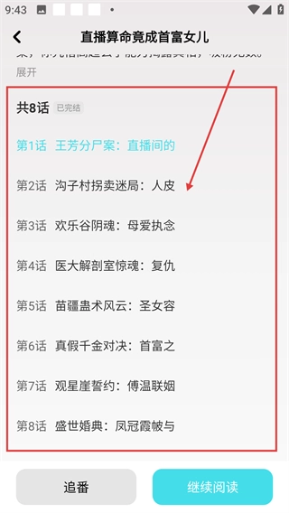 3、在作品的话数列表页面,能看到全部8话的内容,选择对应的话数就能跳转至阅读界面,还可以点击追番按钮收藏该作品。