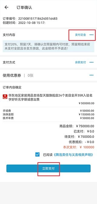 方式一:勾选“付全款”选项,输入支付密码后点击确认按钮,就能直接完成店铺购买。