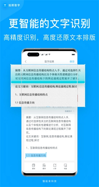 1、拍照取字拥有强劲的文字识别能力,可快速提取照片里的文字内容,识别准确率达到99%。
