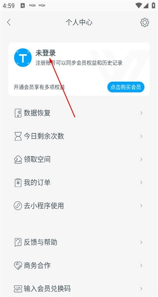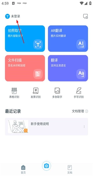 打开软件进入首页后,能看到拍照取字等功能,点击左上角的“未登录”按钮即可进入个人中心页面。