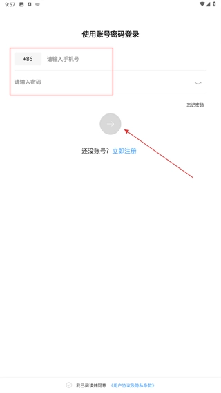 2、在账号密码登录页面,依次填写【请输入手机号】和【请输入密码】的内容,勾选相关协议后即可完成登录操作;若没有账号,点击【立即注册】按钮进行注册即可。