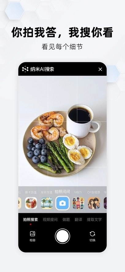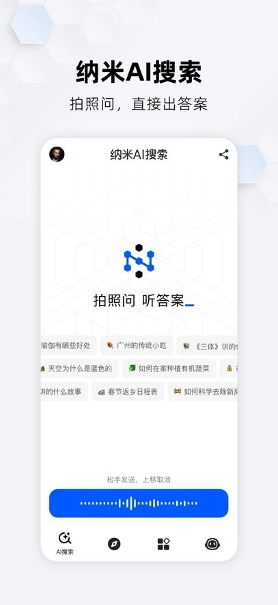 纳米AI搜索,拍照提问,立即呈现答案!纳米AI搜索,重新诠释AI搜索的内涵!纳米AI搜索,开启全新的问答模式,让搜索过程更简单、更直观!