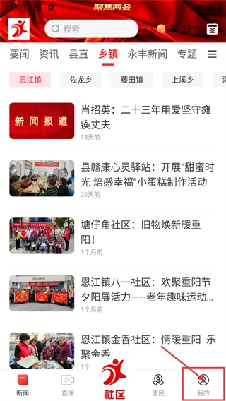 进入展示乡镇新闻的社区页面后,点击底部导航栏中的【我的】选项,即可进入具备互动功能的个人中心页面。