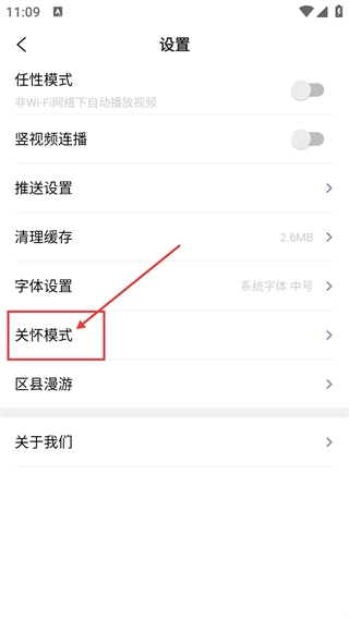 3、进入设置页面后,找到【关怀模式】选项并点击,即可开启更适配老年用户的界面显示模式,优化资讯浏览体验。