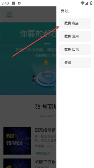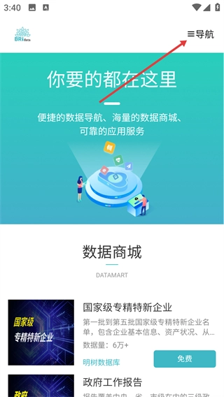 1、在【明树数据】首页,点击右上角的【导航】按钮,就能展开功能菜单,从而快速切换到数据商店、数据应用等模块。
