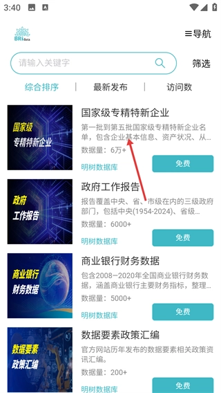 3、在数据商店页面,能够借助搜索、排序(综合排序/最新发布等方式)来筛选资源,点击目标数据(例如国家级专精特新企业)即可进入详情页。