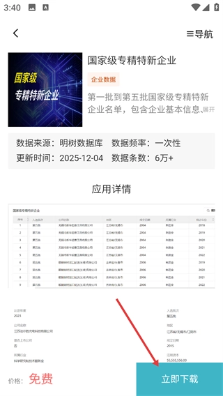 4、进入数据详情页后,能够查看数据来源、更新时间等信息,在确认符合需求后点击【立即】按钮,即可获取该数据资源。
