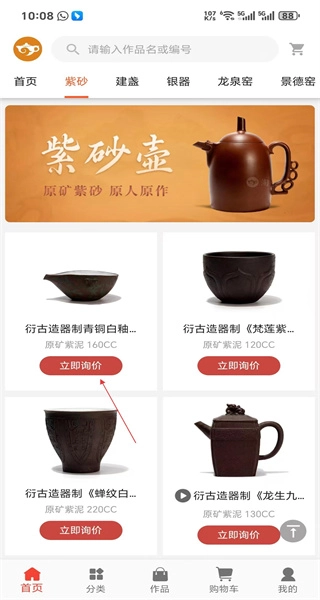 完成登录操作后返回首页,点击紫砂分类选项,即可进入紫砂壶相关器具的展示与咨询页面。