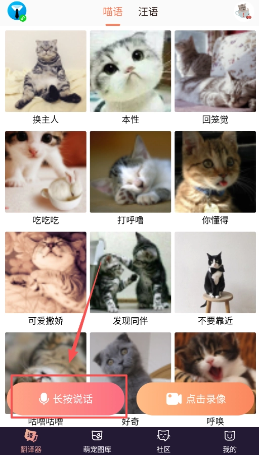 1、启动软件后,在主界面底部找到并点击翻译器功能,选择喵语或汪语模式,长按录音按钮录制宠物的叫声,像呼噜声或者好奇时发出的声音都可以。