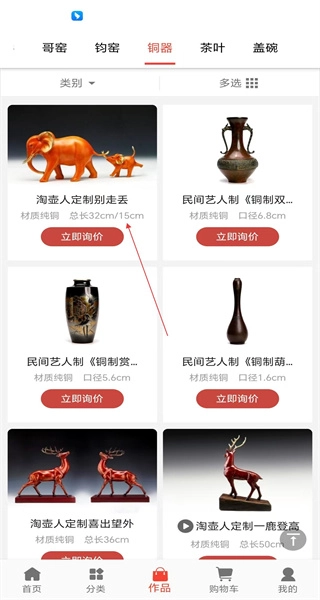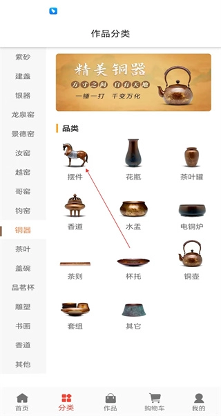 打开软件后,进入作品分类页面,在众多分类中找到紫砂等类别,接着点击铜器分类,即可进入铜器作品展示页面。