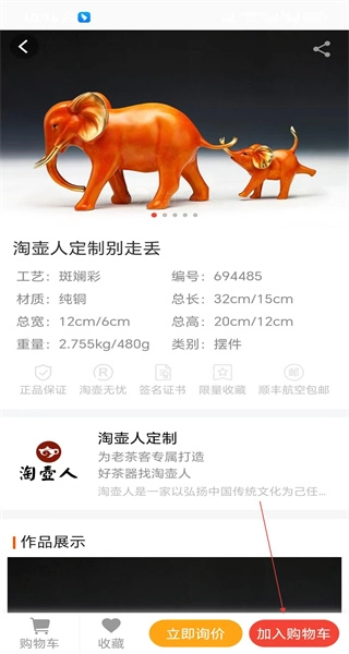 4、进入作品详情页面,在查看工艺材质等相关信息后,点击“加入购物车”按钮,即可将该摆件添加至购物车中。