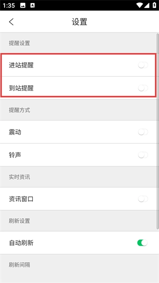 3、进入【设置】页面后,找到【提醒设置】区域,就能看到【进站提醒】【到站提醒】等功能的开关选项。