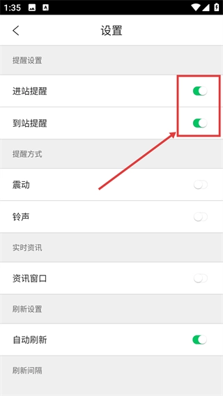 4、进入【提醒设置】页面后,找到【进站提醒】和【到站提醒】对应的开关按钮,点击即可启用这两项提醒功能。