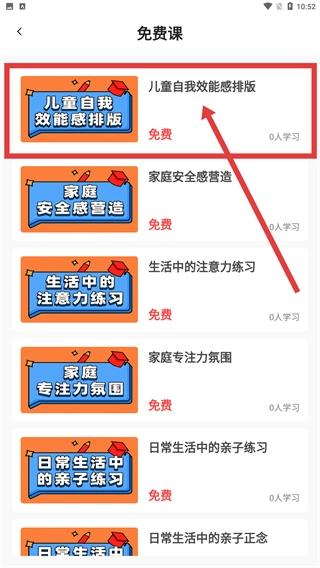 3、在免费课列表里,挑选你想学习的目标课程(比如【儿童自我效能感排版】这门课),然后点击进入该课程的学习页面。
