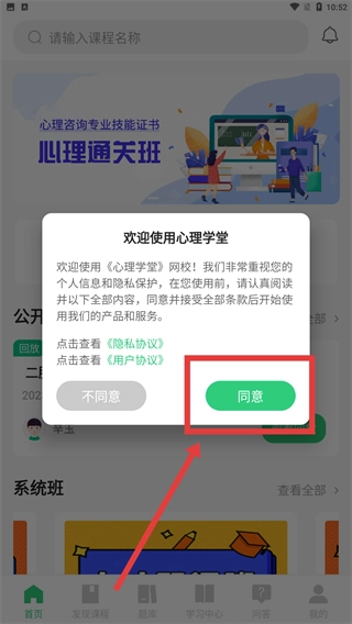 1、仔细阅读【心理学堂】的隐私协议和用户协议,确认无误后点击【同意】按钮,即可进入应用的课程浏览界面。