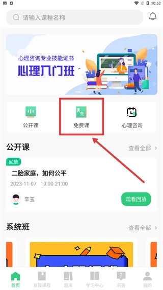 在首页的功能栏中,点击【免费课】这个选项,就能进入免费课程的列表页面,查看可以学习的免费内容。