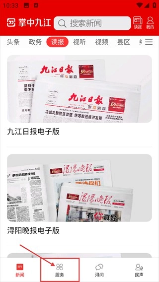 1、打开【掌中九江】的读报页面后,点击底部导航栏的【服务】按钮,就能进入生活服务和政务服务的功能区域。