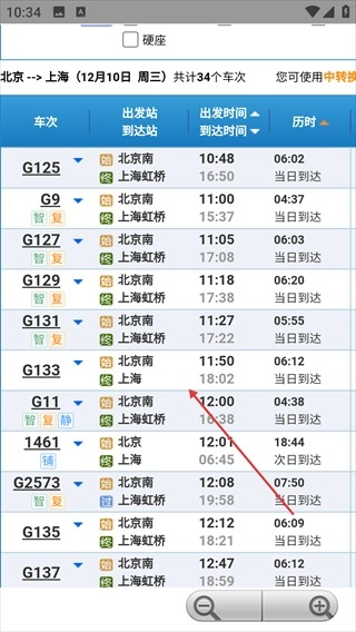 4、点击查询按钮后,页面会呈现出对应日期的车次清单,能够查看【G125】等车次的发车时间、抵达时间以及行程时长等信息。