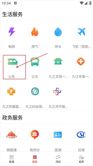 2、进入服务页面后,在【生活服务】板块里找到【火车】选项并点击,就能进入铁路相关的服务界面。