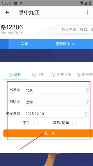 3、进入铁路服务界面后,填写【出发地】【到达地】【2025-12-10】等信息,点击【查询】按钮获取车票信息。