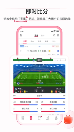 1、实时呈现比分与赛事统计数据,以快速响应比赛动态变化,助力用户第一时间掌握赛事进程中的所有关键信息。