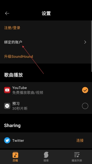 3、进入设置页面后,找到并点击【绑定的账户】这一选项,即可进入账户绑定的操作界面。