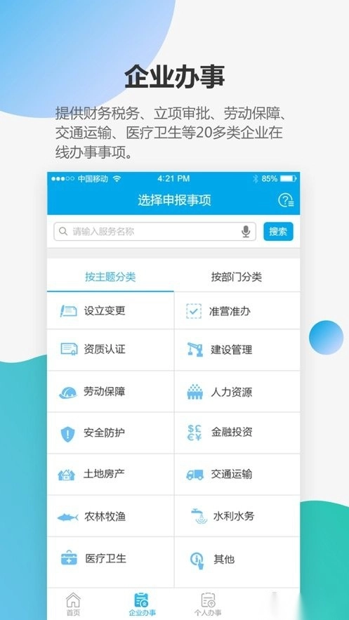 个人可通过“个人办事”入口直接进入个人办事事项页面,目前该事项已覆盖婚育、户籍、教育、就业、医疗、交通等11个主题,提供共计111项办事服务。企业则通过“企业办事”入口进入企业办事事项页面,该事项已覆盖设立变更、财务税务、资质认证、质量检验等20个主题,提供共计614项办事服务。