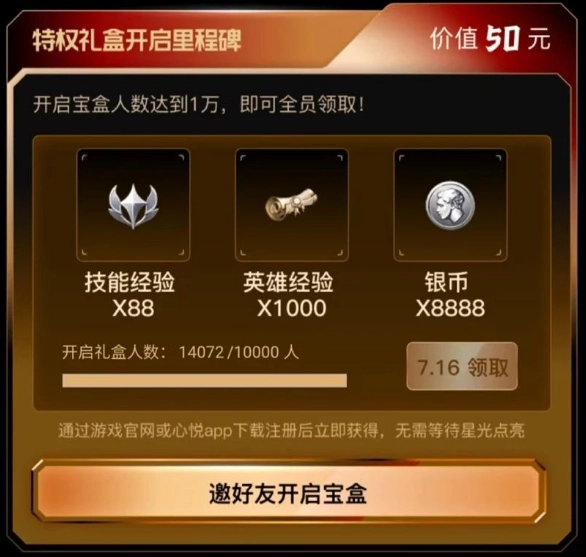 活动期间,若开启宝盒的人数达到1万人,那么在7月16日之后,大家就可以前来领取“技能经验×88、英雄经验×1000、银币×8888”的奖励。