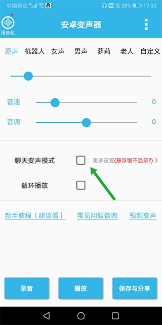 1、首先打开软件后进行相关设置,把聊天变声模式与循环播放功能开启