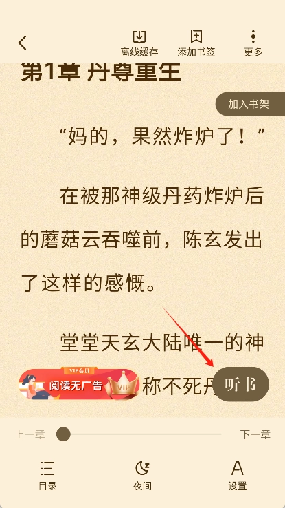 3、开启听书模式:轻点阅读界面的中间区域,进入阅读设置后找到并点击听书按钮。