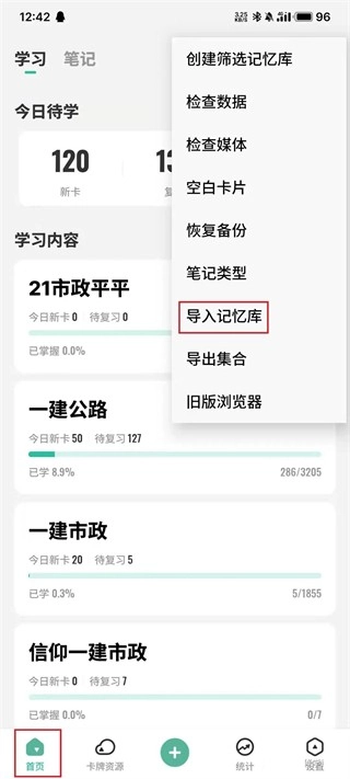 完成上述操作后,返回软件首页,点击“统计”选项查看学习进度信息,此时相关信息已被重置。
