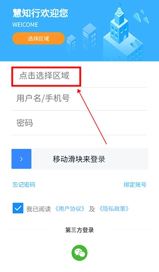 1、在本站安装慧知行初中版的最新版本,完成安装后进入登录页面,点击页面上的“选择区域”按钮。