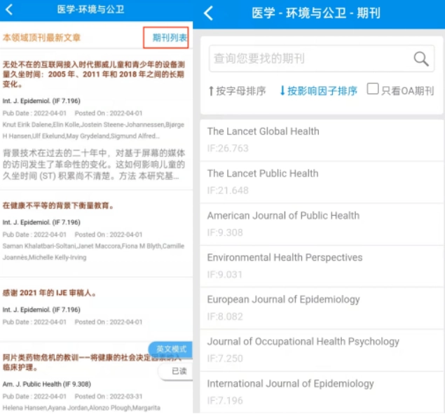 选择期刊列表(左图)后,可获取期刊目录(右图),其默认排序方式为字母排序,在此我们选择按影响因子排序。