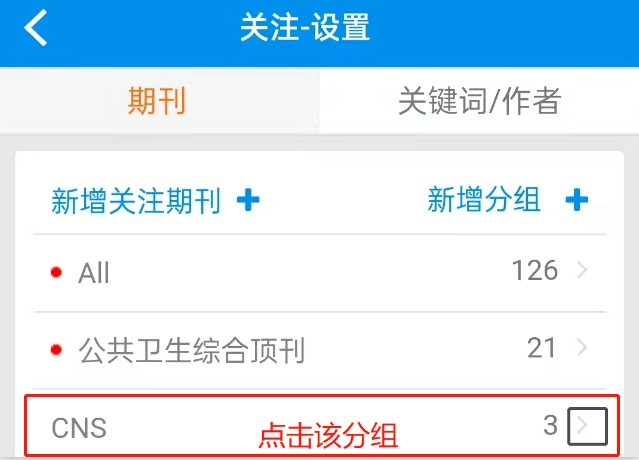 操作步骤如下:首先在期刊界面找到并点击“关注”选项,接着对关键词、作者以及期刊进行定制设置,完成定制后,点击已设定好的关键词、作者和期刊,触发搜索功能,即可获取与之相关的最新文献。