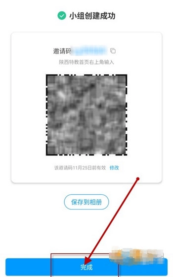 5、小组创建成功后,系统会自动生成邀请码与二维码,用于邀请新成员加入,点击“完成”按钮即可结束创建流程。