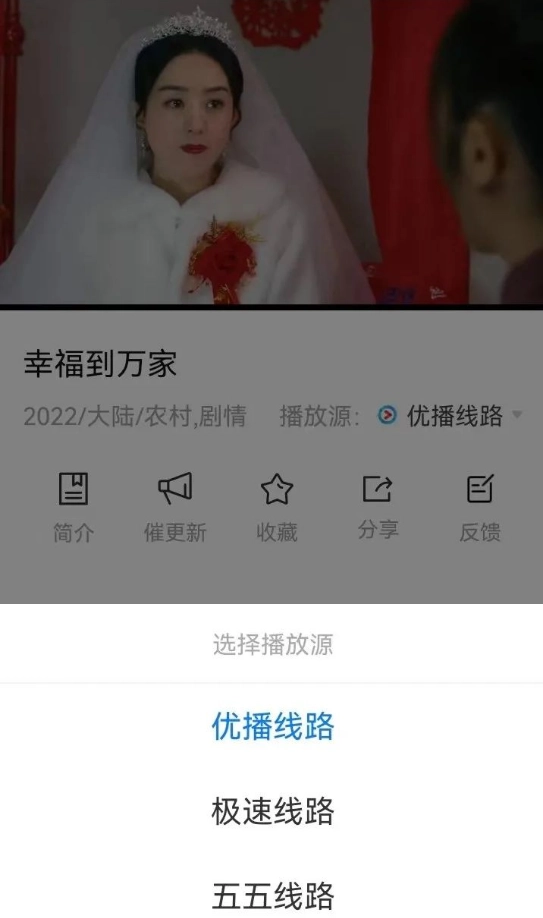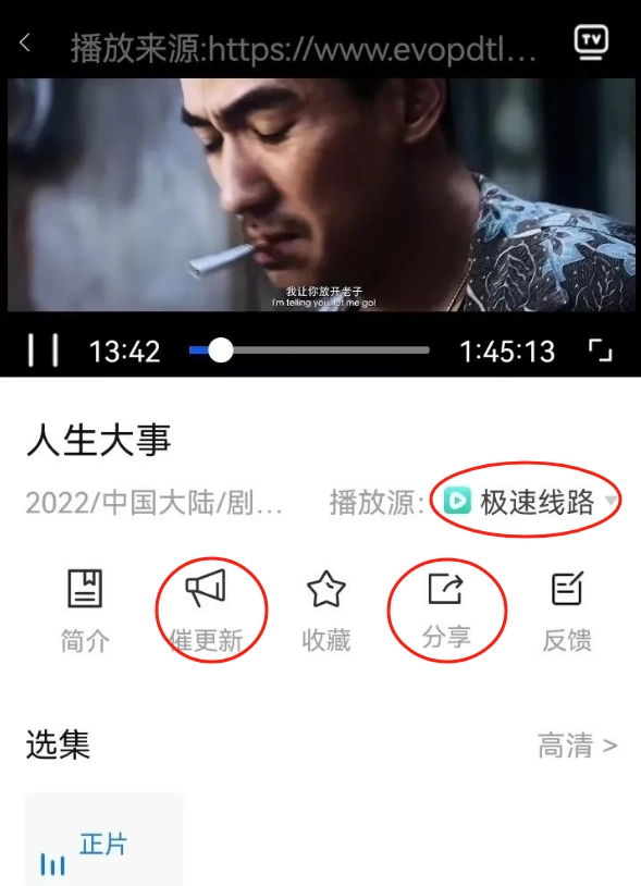 4. 播放界面支持播放源切换,还能进行催更、分享、收藏等操作。
