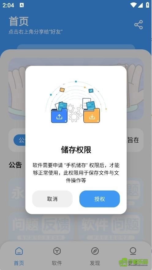 1、打开三岁软件库2.0,首次启动时,用户需要授予相关权限。