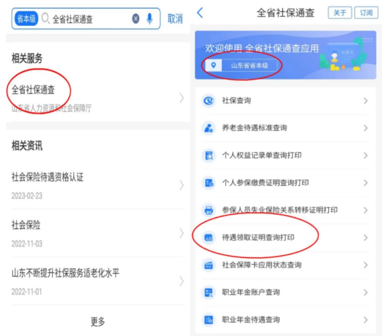 在首页搜索栏输入“全省社保通查”,接着点击页面左上角的定位功能,选定待遇领取所在地后,再点击“待遇领取证明查询打印”选项,就能完成养老金查询和待遇领取证明的打印操作了。