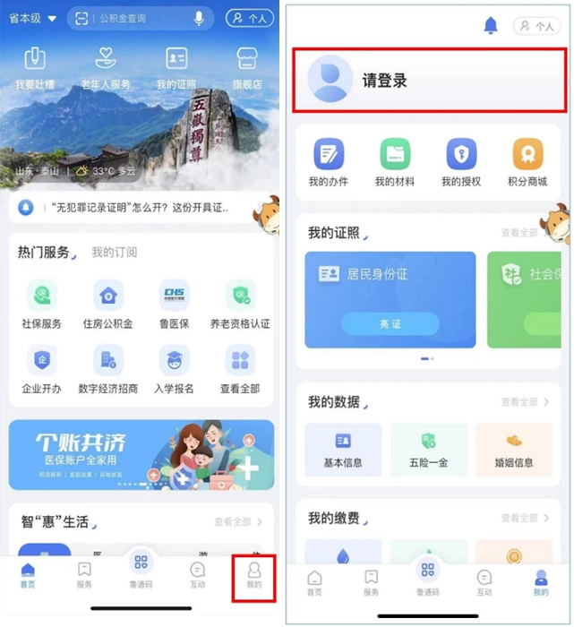 进入“爱山东”主界面后,点击“我的”板块,接着点击右上角的头像,选择个人用户类型,再点击“立即注册”按钮,输入日常使用的手机号码,获取短信验证码,最后点击登录即可。