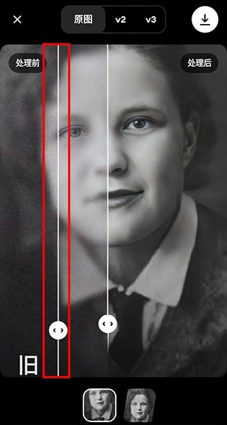 4、处理完成后进入下方界面,拖动中间的指针就能查看处理前后的对比效果