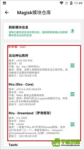 进入magisk模板仓库后,这里有众多功能框架,你可挑选所需的。