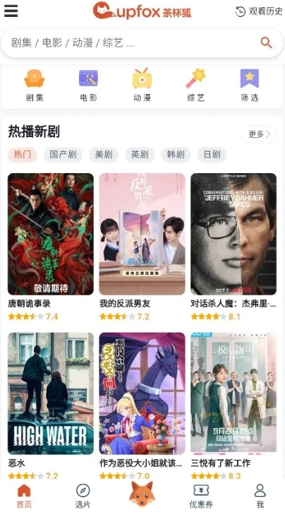 首页是影视界面,汇聚了电视剧、电影、综艺、动漫等各类丰富的影视资源。