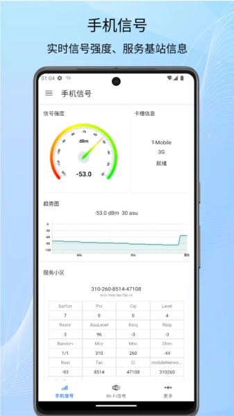 可实时检测手机信号强度,支持查询SIM卡信息、运营商等相关内容,还能查询服务小区的详细信息,包括小区信号强度、lac/tac/ci等参数,同时提供浏览附近小区信息等信号检测相关服务。