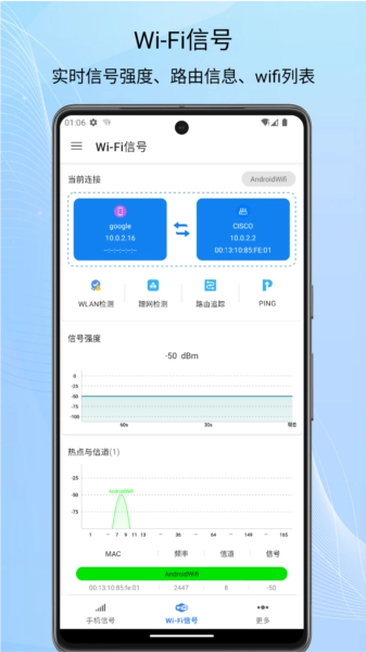 实时监测WIFI信号强度,查询WIFI相关信息,包括信号强度、mac地址、信道、IP配置、连接速率等内容,同时获取wifi信号与信道等信息。