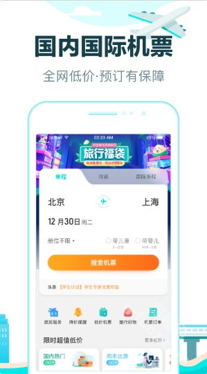 3、机票预订:支持查询12000条国内及国际航线,帮您筛选出性价比最优的机票,无需注册就能直接在线完成付款购票流程