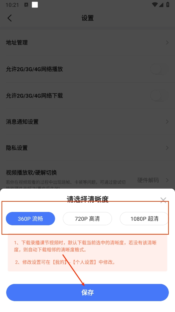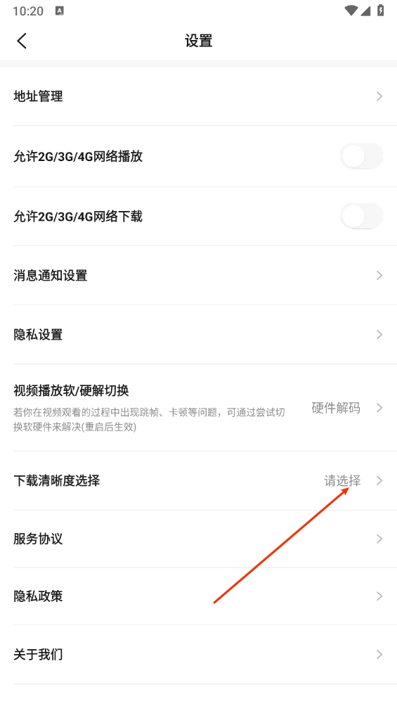 2、如图所示,在设置页面点击"清晰度选择"打卡。