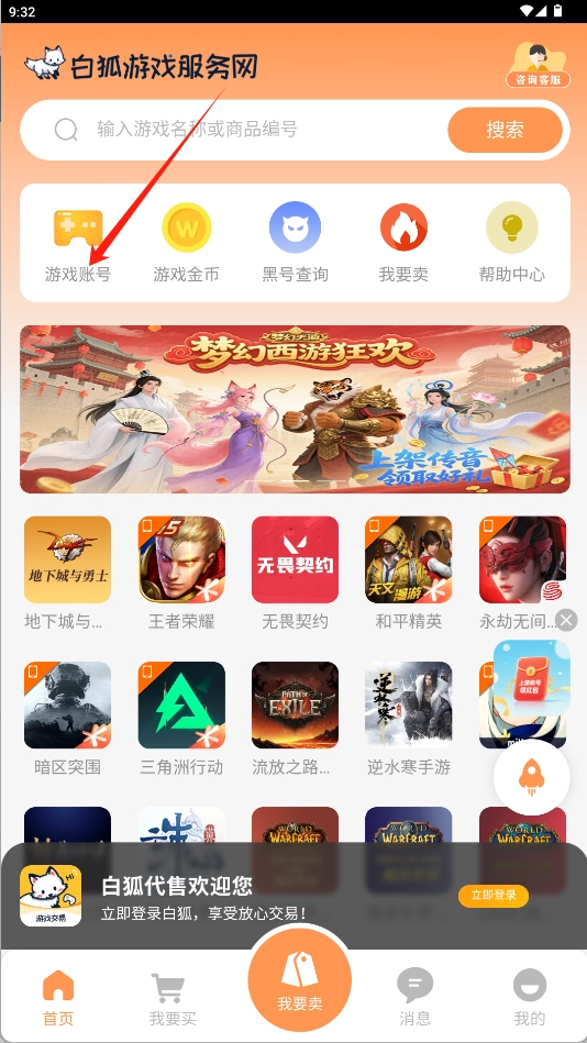 1、在应用首页找到“游戏账号”按钮并点击,即可进入账号交易板块。